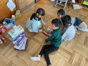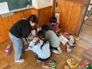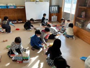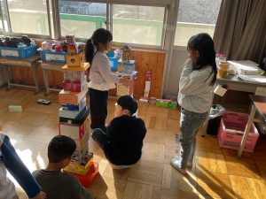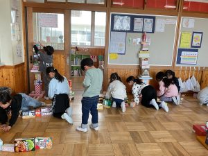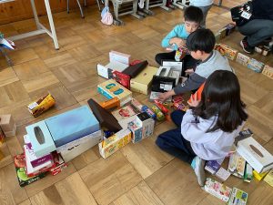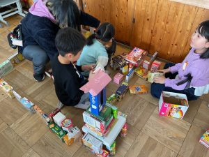 図工「いっぱいつかって なにしよう」という学習では、たくさんの箱を使って思い思いの作品づくりを楽しみました。高く積み上げてタワーにしたりお城をつくったりして、まわりには道や家、車もつくり、街や風景も考えていました。「ここをつなげよう!」「ここは何にする?」「箱をもっと持ってくるね!」など、班の仲間とたくさん会話をしながら、わくわくした様子で楽しく活動することができました。箱の回収のご協力をありがとうございました。