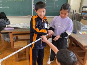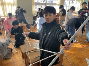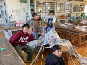 図工の単元「組んで立ててつなぐんぐん」では、新聞紙を丸めてテープでとめた棒を使い、それらを組み合わせてつなぎながら活動を行いました。試行錯誤しながら形を工夫し、最終的には全員が中に入ることのできる作品を完成させました。グループのみんなと声をかけ合い、協力して作ることができました。
