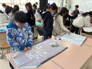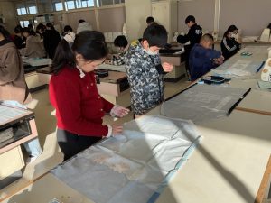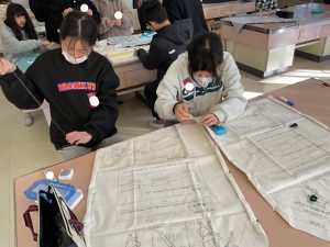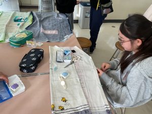 玉結び,玉留めを復習しながら,しつけ縫い,ミシンで布地を縫っていきます。