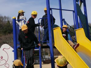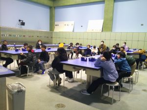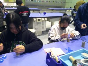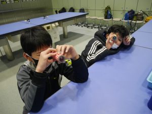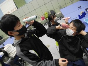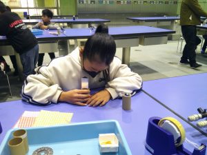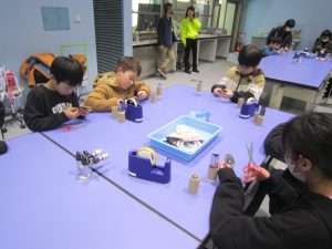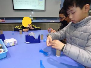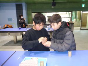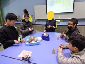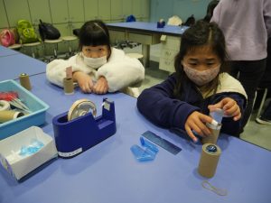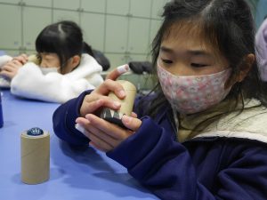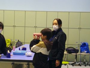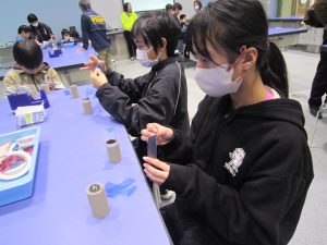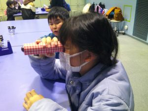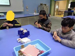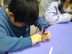 次に、大きなビー玉を使った万華鏡を作りました。グループで助け合ったり、リーダーが「ごみはここに入れてね。」と声をかけたり、仲良く作ったりすることができました。