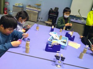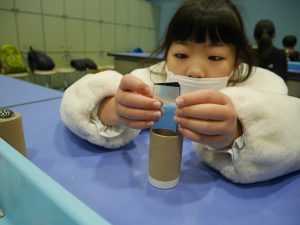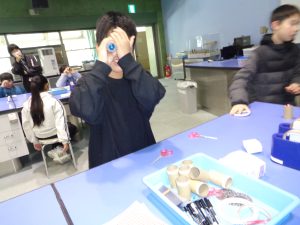 作りながら、ビー玉をのぞいてみたり、三角に組み合わせた鏡をのぞいてみたり、楽しく作っていました。