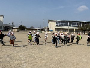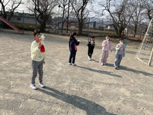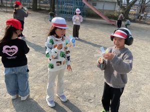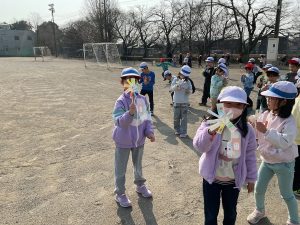 生活科で冬の遊びを考えました。風を使ったおもちゃができることを知って、風車を作りました。この日は風が強く、立っているだけで風車がまわり、回すことや見える色の変化を楽しみました。