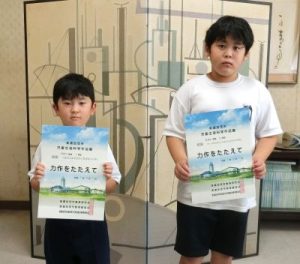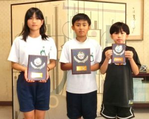 令和7年度の夏休みの各種作品展で、優秀な成績を収めた児童たちに林清美校長から表彰してもらいました。