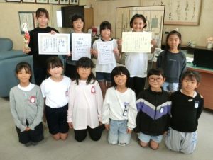第16回 千秋カップ・「桶狭間の戦い【夏の陣2025】」において、優秀な成績を収めた児童たちが林清美校長に喜びの報告をしました。