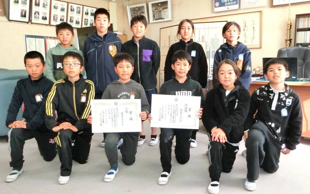 令和7年度 理事長旗争奪リーグ戦大会、及び令和7年度 学童特別(Aブロック)大会の2つの大会において、優秀な成績を収めた児童たちが林清美校長に喜びの報告をしました。