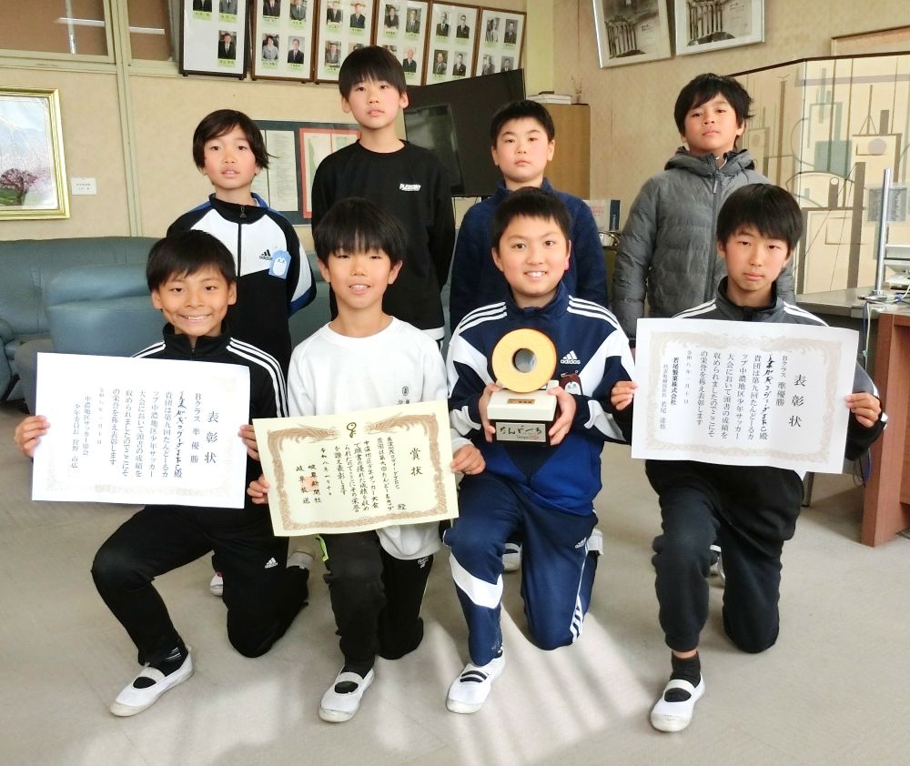 第9回 たんどーるカップ中濃地区少年サッカー大会において、優秀な成績を収めた児童たちが林清美校長に喜びの報告をしました。