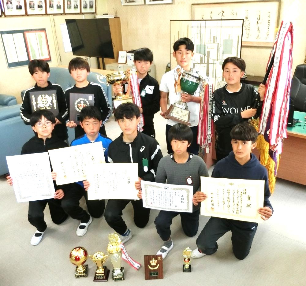 第24回 リバーサイドカップ少年サッカー大会 及び ろうきんカップ 第58回 中日旗争奪岐阜県少年サッカー選手権大会において、優秀な成績を収めた児童たちが林清美校長に喜びの報告をしました。
