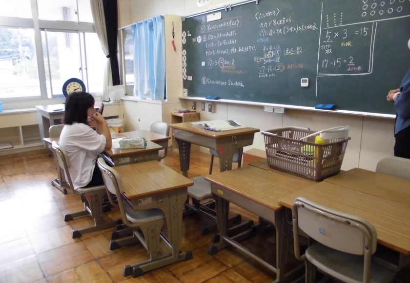 2年生は、算数のたしざんの筆算。答えの見当をつけて解いていました。