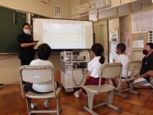 1年生は、算数の「ひきざん」の学習をしていました。モニターで、教科書の問題をみんなで考え、その後、自分で解いて進めていました。