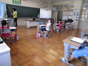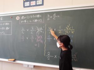 6年生は、算数の「分数のかけ算」。考え方を、黒板で一生懸命説明する姿がありました。