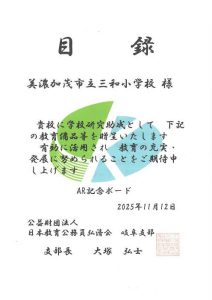11月12日、公益財団法人 日本教育公務員弘済会 岐阜支部より、稲川貴士様にお越しいただいて、学校研究助成としていただいたAR記念ボードの贈呈式が行われました。また、このAR記念ボードの購入にあたっては、美濃加茂市アイビー不動産様からの寄付金も活用しています。今後も子供たちの教育の充実に努めます。ありがとうございました。