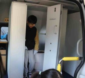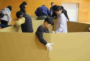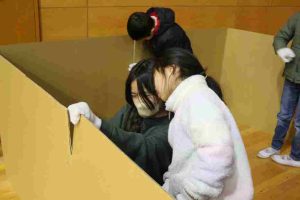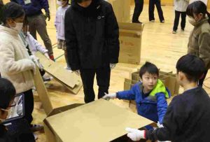 2月2日、全校で防災教室を行いました。市の防災課の方から、ハザードマップを確認しながら三和町で起こりそうな災害についてや、南海トラフ地震や直下型地震について教えていただきました。その後、体育館を避難所に見立て、段ボールパーテーションや段ボールベッドを組み立てました。美濃加茂市に導入されたトイレカーにもなる「マルモビ」を見学することもできました。乾パンや保存食の根菜ご飯を持ち帰りました。家庭でも防災会議を開いて、災害への備えを進めてください。