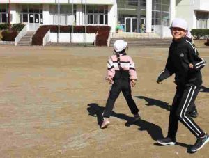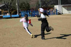 2月3日、げんき委員会が、かぜ予防の遊びを計画し、昼休みに全校で「ケイドロ」を楽しみました。運動場を走り回る子供たち。寒さに負けずに、元気に過ごしています。