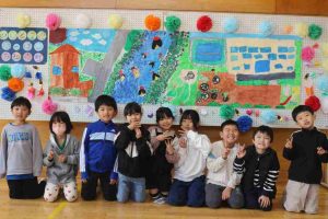 1・2年生が、町探検でみつけた三和のよいところを、絵にかきました。三和は、きれいなところ、楽しいところ、おいしいところ、やさしいところ、よいところがいっぱいのすてきな町です。