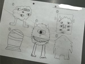今週は、英語の授業で大きさ、長さの学習をしました。大きな声で、「ビック!」「ロング!」と練習をしました。授業の最後には、学習したことを使って、足が長いモンスターや目が大きいモンスターを絵にかきました。