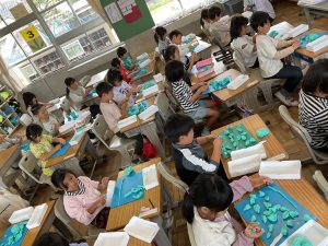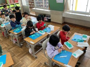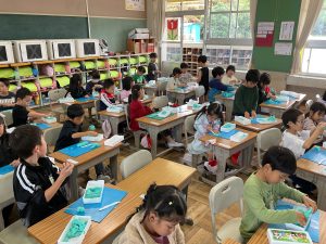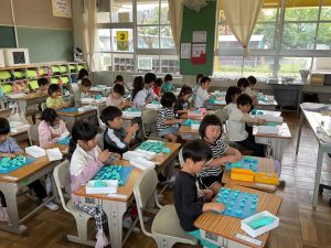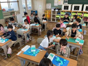 金曜日は図工の学習で粘土を使ってお弁当を作りました。自分の好きなおかずを再現しようと一生懸命活動に取り組んでいました。たこさんウインナーやハンバーガー,ミニトマトなど,好きなものを細かなところまで再現していました。素敵なお弁当がたくさん出来上がったので,みんなで校庭にピクニックに出かけました。自分のお弁当を紹介しあう姿がとても素敵でした。
