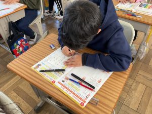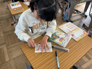 本日(11月21日)に美濃加茂郵便局さんより、お手紙講座をしていただきました。つきましては、近日中に授業で使用した年賀ハガキを持ち帰ります。誰に送るのかお子様と話し、その宛先や住所をご家庭で記入していただければと思います。年賀はがきの受付は12月15日からです。よろしくお願いします。