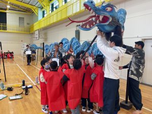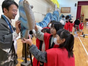 17日(月)には、「ミニおん祭」が行われました。美濃加茂市の誇りである「おん祭」を支えている、35名の名人さんをお招きしました。おん祭で使われている、本物の大蛇や太鼓、手筒花火や鉄砲を目の前に、子どもたちは目を輝かせていました。質問タイムでは、名人の方々に、おん祭への思いを聞き、美濃加茂市やおん祭についてたくさん学ぶことができました。ミニおん祭が終わると、「もっと知りたい!」「来年はおん祭に行って本物を見てみたい!」という子どもたちの声が聞こえてきました。おん祭や美濃加茂市をもっと好きになるきっかけになると良いと思います。