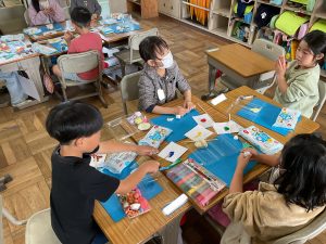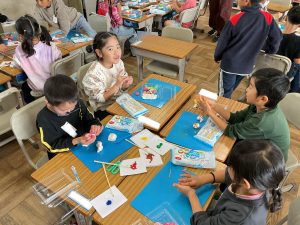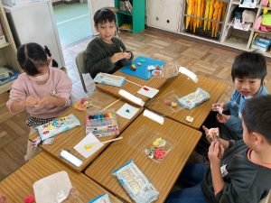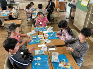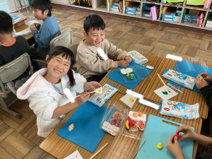 図工で紙粘土を使って,自分だけのお弁当を作っています。絵具を粘土に塗り込んで様々な具材を表現しています。卵焼きやウインナーなど美味しそうなおかずがたくさん出来上がってきました。みんなの希望が詰まった色鮮やかな贅沢なお弁当が出来上がるといいですね。