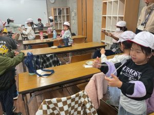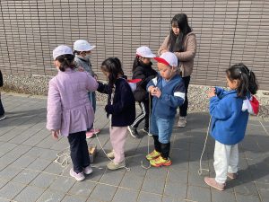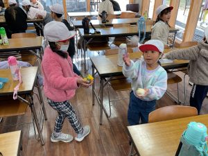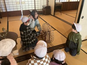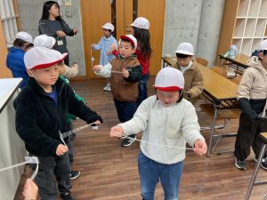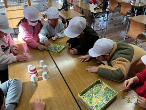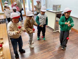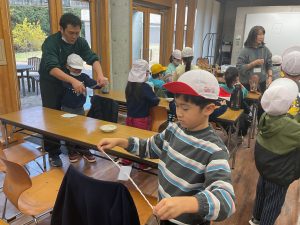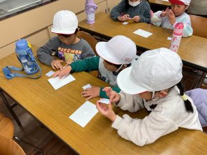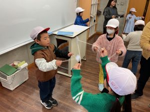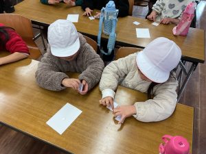 ぶんぶんゴマづくりにも挑戦しました。回し方のコツを掴むのが難しく,苦戦しながらも何度も挑戦し楽しんでいました。おうちに持ち帰ったのでぜひお子様と遊んでみてください。