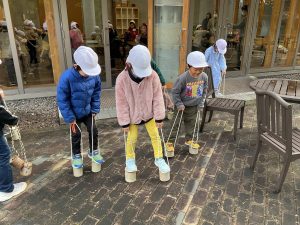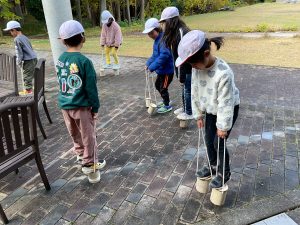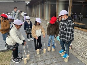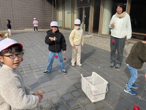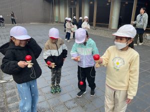 最後に昔遊びの体験をしました。普段目にすることのない遊びもあり夢中になって遊んでいました。子供たちの中には,けん玉が上手なけん玉名人もいました。みんなでなかよく順番を守れるのも素敵な姿でした。