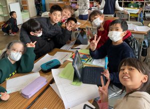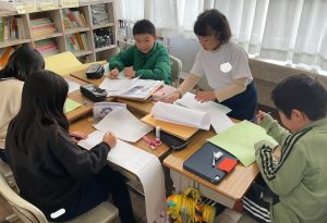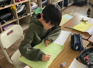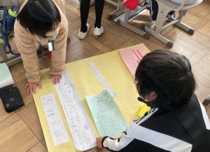 学伝に向けて、1年間の総合学習のまとめ新聞を作成しています。木曽川のきれいさについて、木曽川の災害について、福田太郎八さんについて、坪内逍遥先生について、の4つのテーマに分かれて活動しています。班員は3クラスが入り混じったメンバーですが、協力し合う姿がたくさんです。丁寧に下書きをして記事を書いたり、分かりやすいようにイラストや表を使ったり、1年間の学びが詰まっています。完成が楽しみですね。