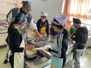先週、今週と家庭科で調理実習を行いました。和食の基本ということで、ご飯とみそ汁を作りました。にぼしの頭とはらわたを取る作業、米を研いで吸水させる作業を、朝から大忙しで行いました。実習の始めの時間には、鍋からだしのいい香りがしていることや、吸水し大きくなっている米の様子に驚いていました。時間や火加減、具材を入れる順番に気をつけて調理することができました。
