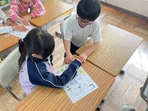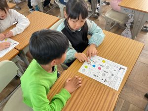 今週はついに外国語の授業が最後を迎えてしまいました。これまで学習を進めてきた「数」や「色・形」などをおさらいしました。「あ、これやった言葉だ!」とこれまでの学習を思い出したり、以前もしたゲームを上手に進める姿がありました。じゃんけんも英語できるようになり、1年の成長を感じた瞬間でした。