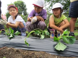 植える前に、苗を実際に見せながら、芋は根が成長してできるものであることや植え方を教えていただきます。