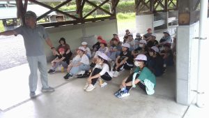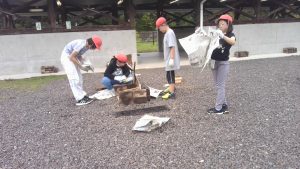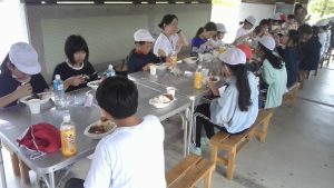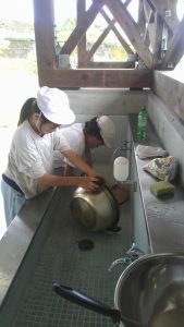 食後は部屋の片づけをして、野外炊事。作業にとりかかる前に全体説明