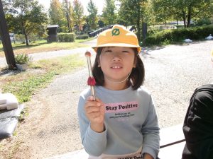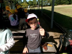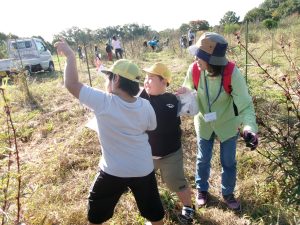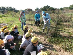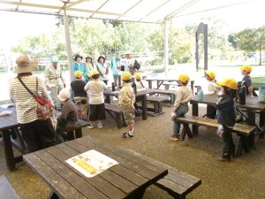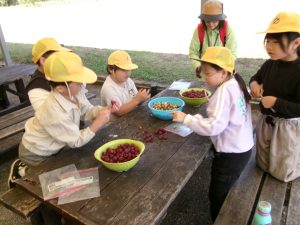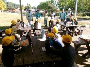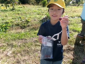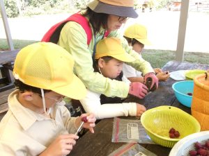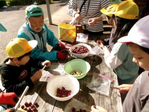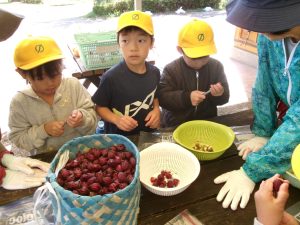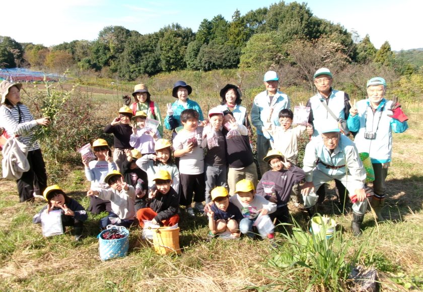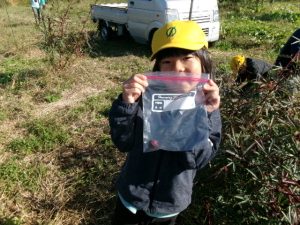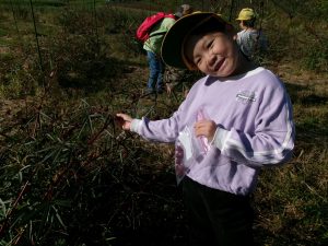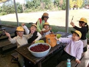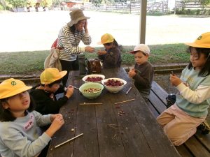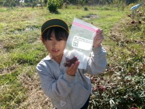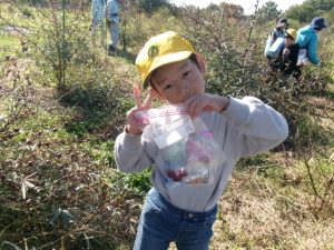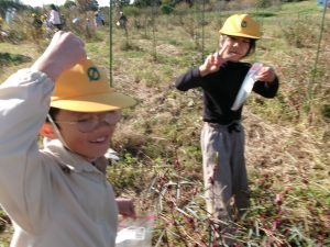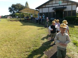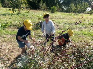 澄みきった青空のもと、1,2年生が、清流里山公園の里山農園に出かけます。そこで、ローゼル摘みの体験をするためです。