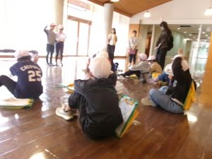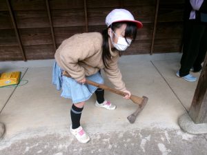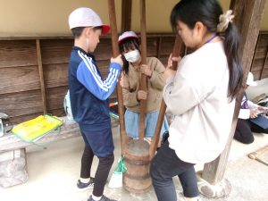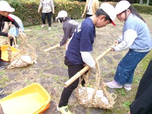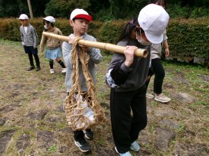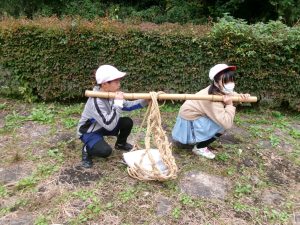 「もっこ」という土等を運搬する道具の使い方を聞き、実体験!