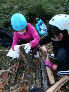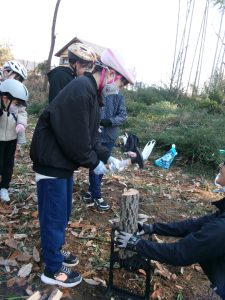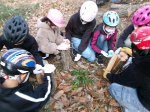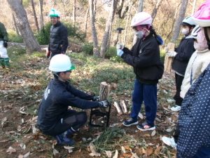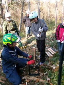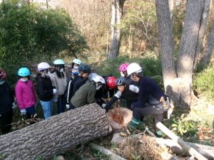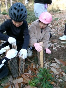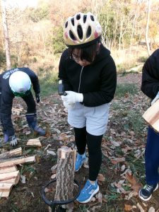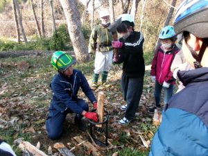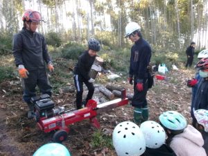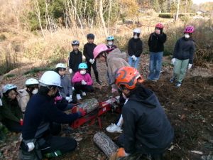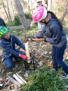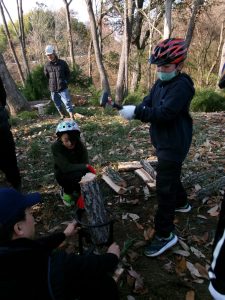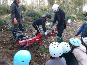 倒木が天板に加工する部分と薪にする部分に分けられ、子供たちは、薪づくり体験をします。
