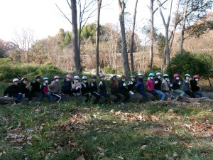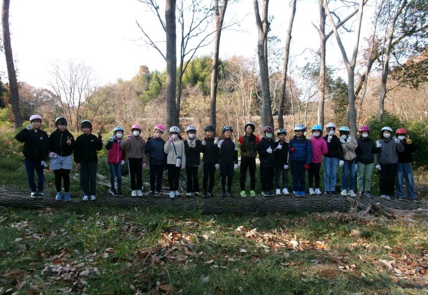 見出しの写真、5年生の子供たちの集合写真なのですが、注目は子供たちの足元です。全員、横倒しになった木の上に立っています。どういうことかというと、この木はアベマキで、子供たちが教室で使用している机の天板に加工し、利用しています。