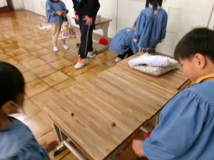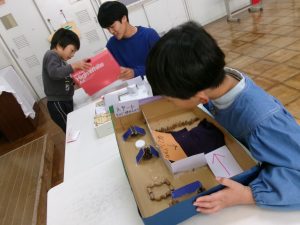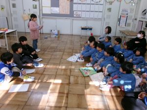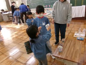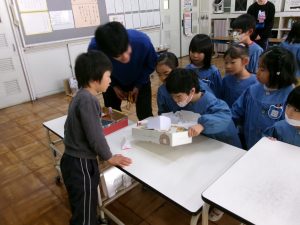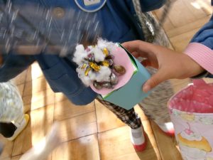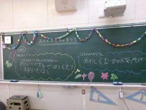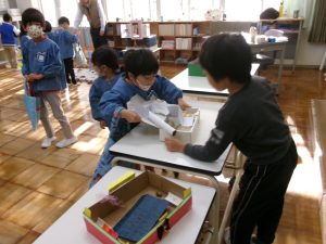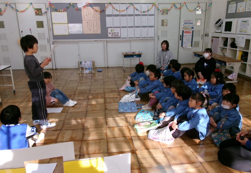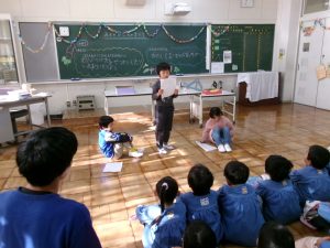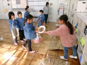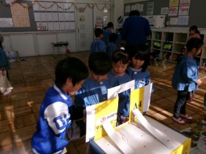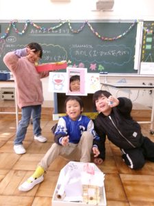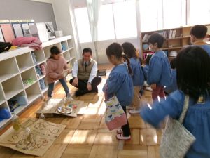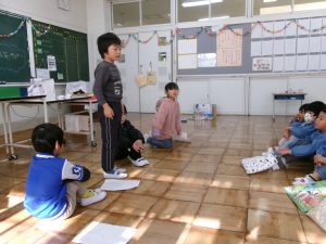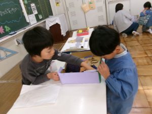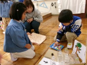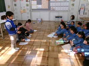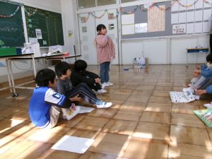 1年生の生活科で、秋のものを使うなどしておもちゃ作りをします。作ったおもちゃは、お店屋さんとしての活動へとつながります。お客さんとしてお迎えするのは、山之上こども園の年長組の子供たちです。この関りが来年度へとつながっていきます。