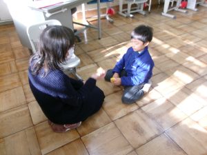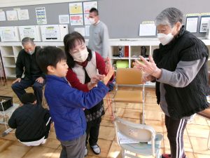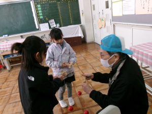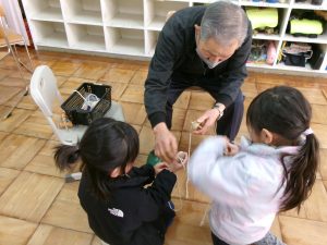 つい先週末に、文化の森で昔遊びをしたばかりの1年生。同じように昔の遊びをします。今度は、学校で、教えてくださる先生は地域の方、遊びの内容は、けん玉は同じだけど、紐をまいて回すコマに、あやとりとお手玉と変わります。