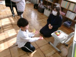 その後、遊び道具は教室にて使えるように管理していくことに。すると、地域の先生に教えていただいたコツをもとに、休み時間のたびに取り組みます。今では、全員、コマを回せます!! すごいぞ。