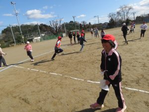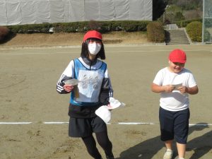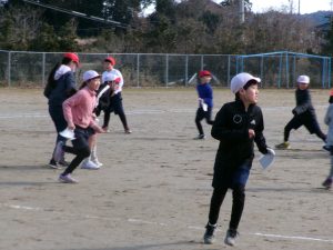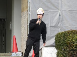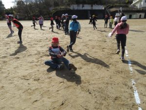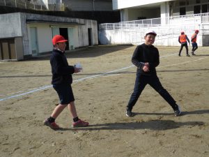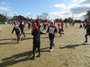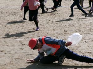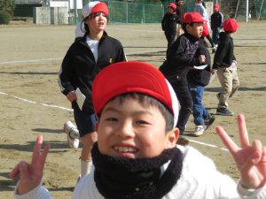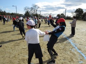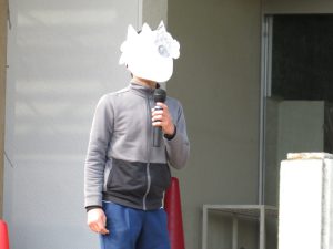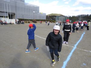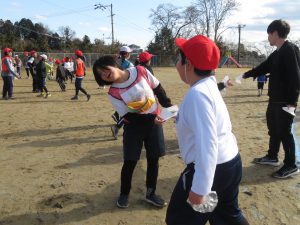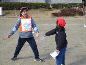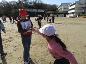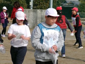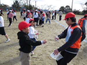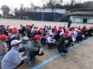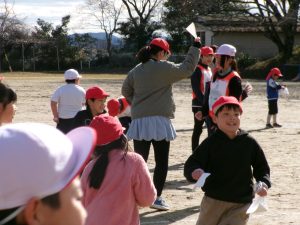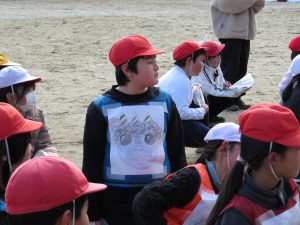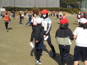 そのキャンペーンが終わった後、全校で鬼ごっこをして遊びます。でも、普通の鬼ごっこではありません。ふつうは鬼に捕まったら、それで終わりですが、捕まっても豆(カード)を持っていて、それを鬼にぶつければ、その鬼を退治でき、また逃げられるのです。見出しの写真が、そのことを全校に説明している場面です。(ということは、豆を持っている限り、延々と逃げれる鬼ごっこという訳です)