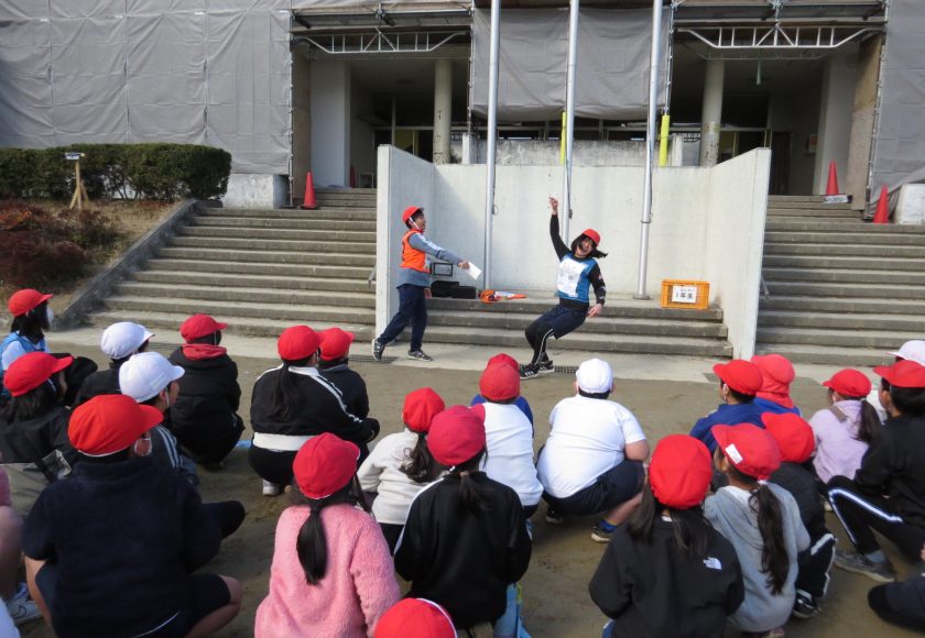 鬼です。鬼は前もって、地域でのあいさつができなければ、子供たちをさらっていくと宣言していたので出てきました。でも、全校の挨拶パワーで、鬼は退散。無事、山之上小学校の子供たちは守られます。